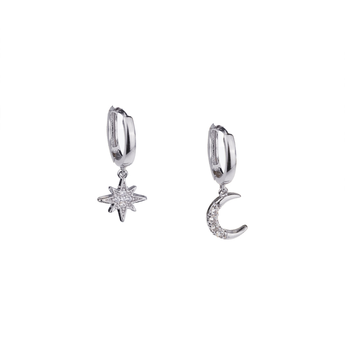 Moon & Star Huggie Hoop Earrings with Drop Charms, White Rhodium