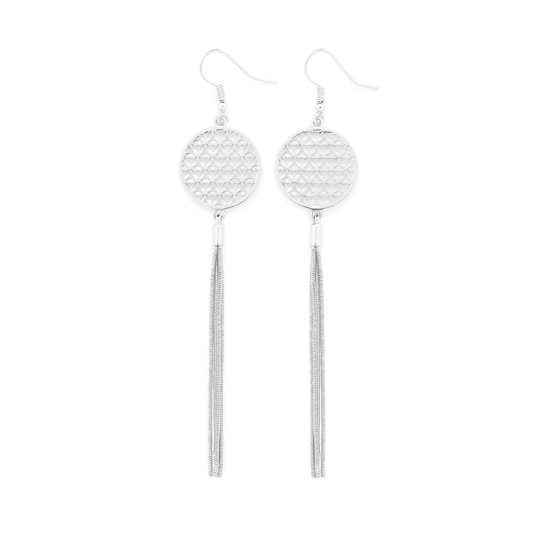 Flower of Life Protection Tassel Earrings, White Rhodium