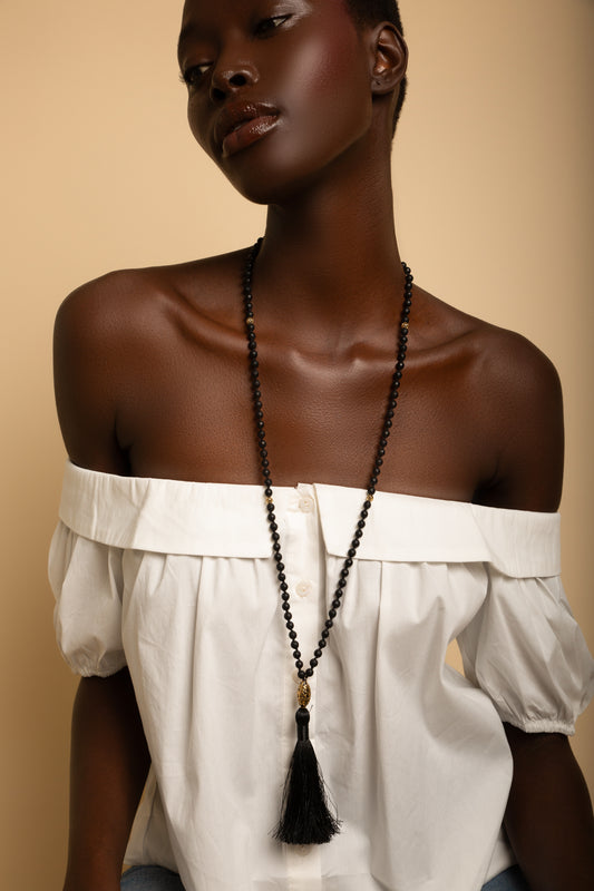 Energy Protection Black Onyx Repousse Mala, White Rhodium Plated
