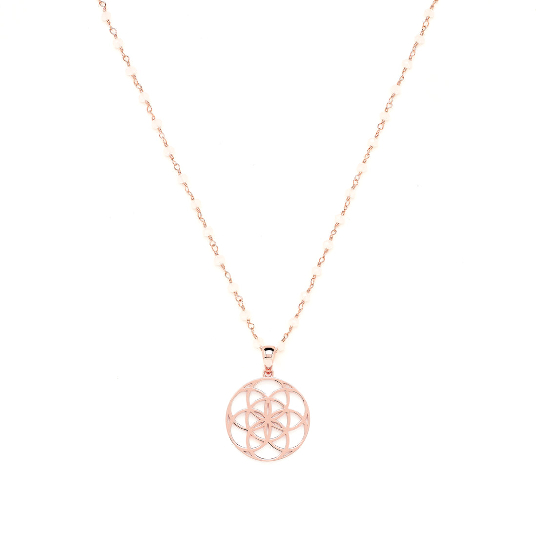 Seed of Life Feminine Power Amulet, White Chalcedony Chain, Rose Gold Plated