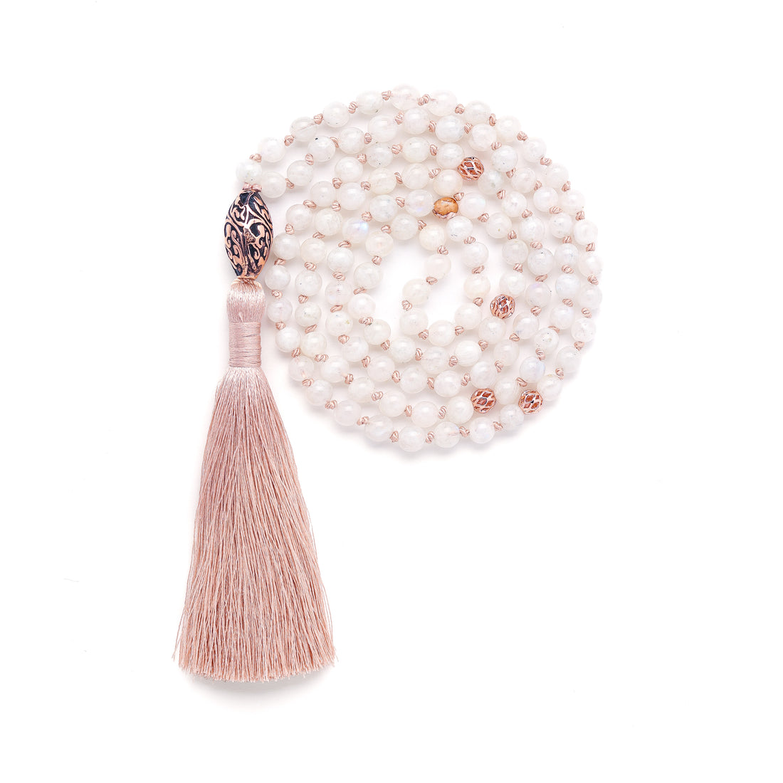 Divine Love 108 Bead Mala, Morganite, Antique Repousse