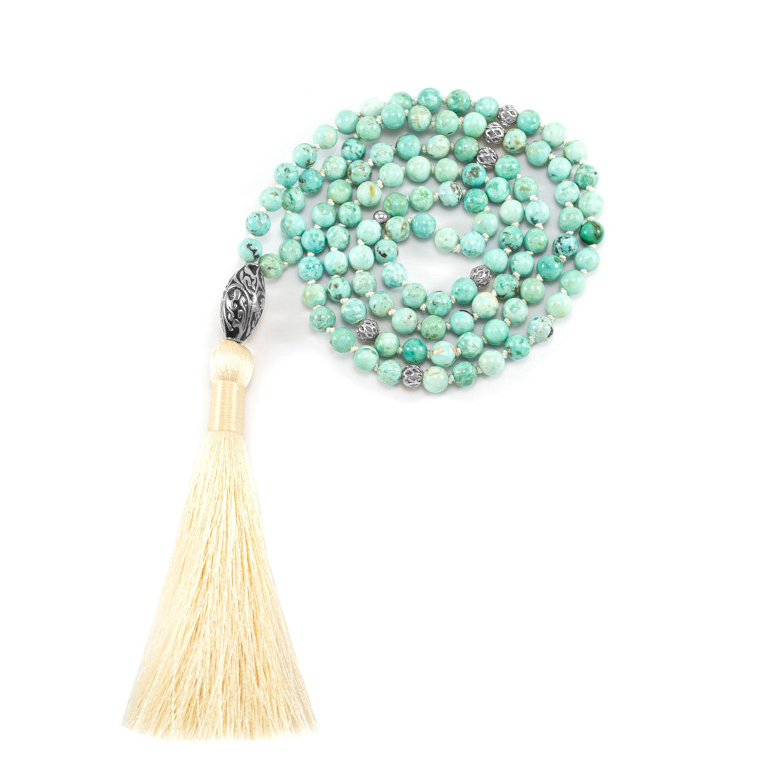 Good Fortune Peruvian Turquoise Repousse Mala, White Rhodium Plated