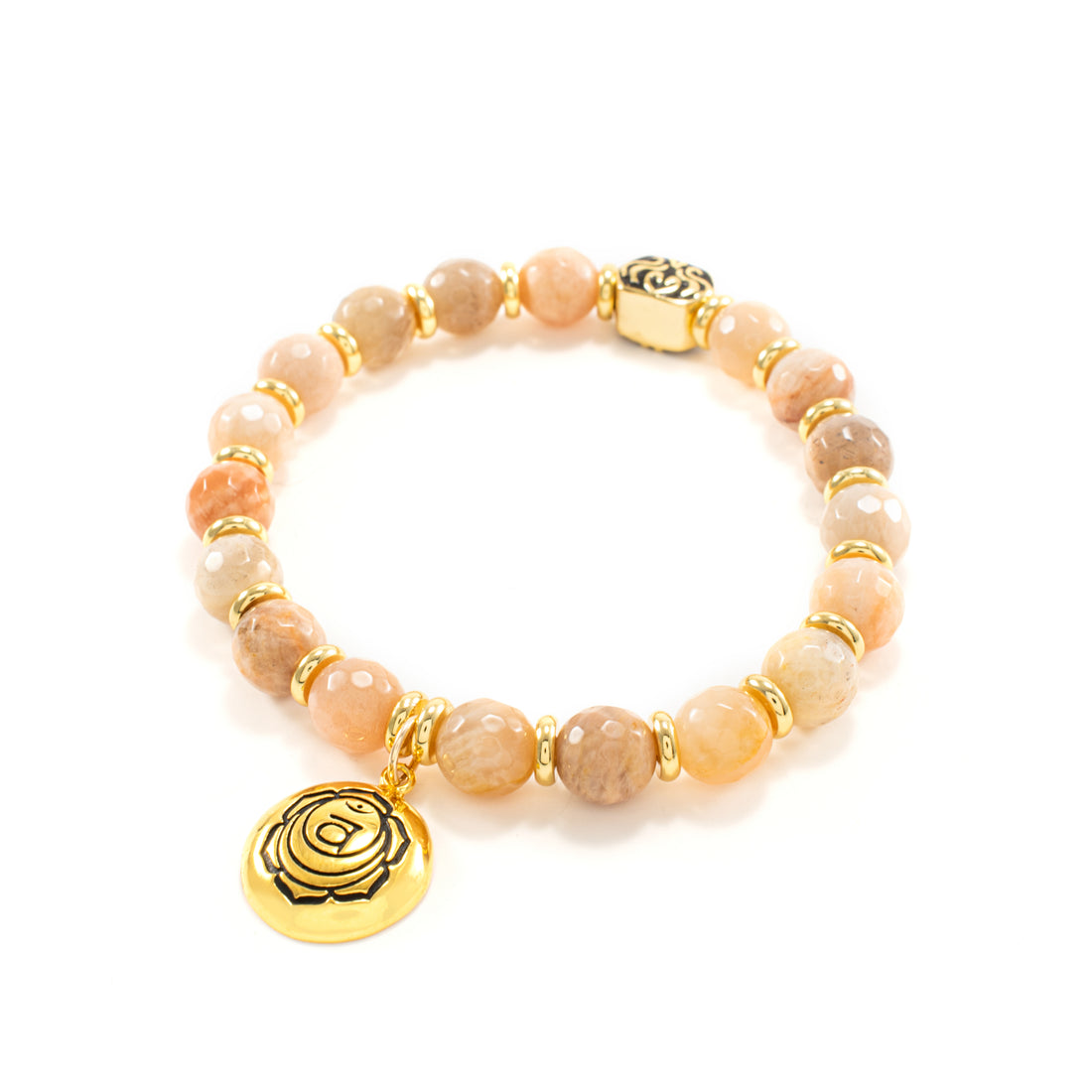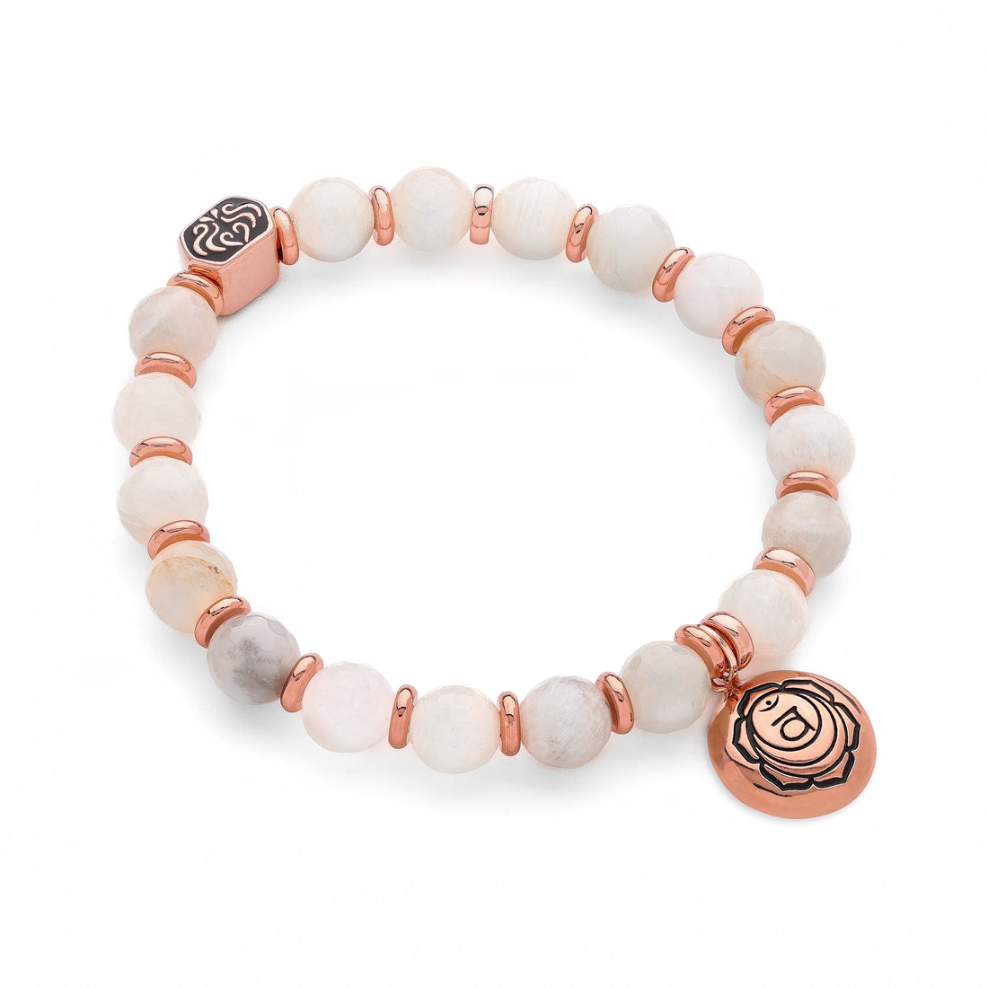 Activate your Sacral Chakra with this creamy moonstone stretch bracelet that features an engraved rose...