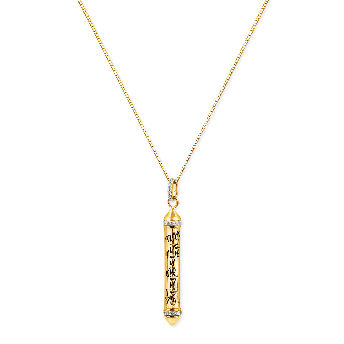 OM MANI PADME HUM 18k Gold, White Topaz Prayer Necklace, *Seen in Harper's Bazaar UK