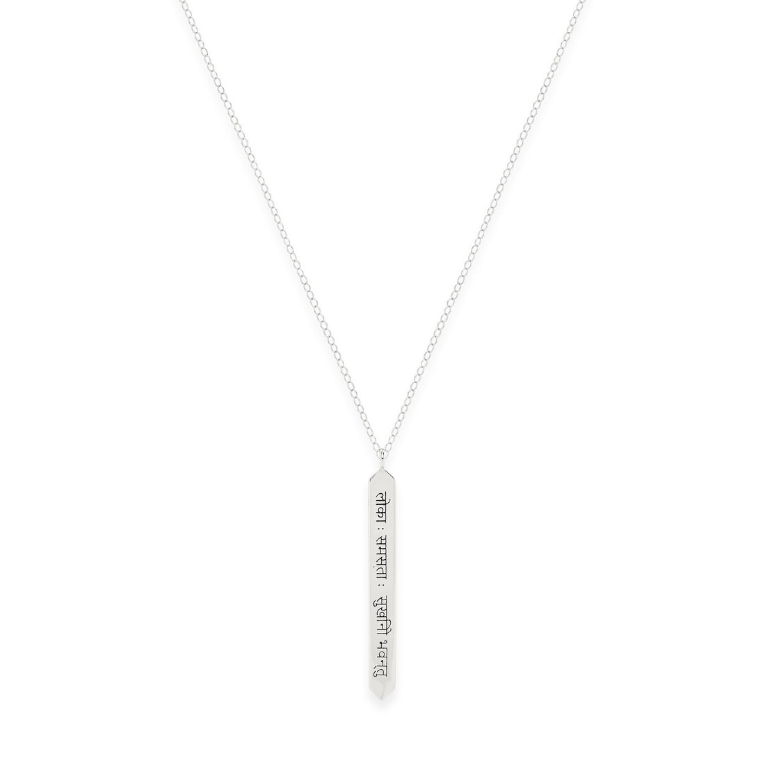 Sanskrit Chant "May All Beings Be Happy & Free" White Rhodium Bar Necklace