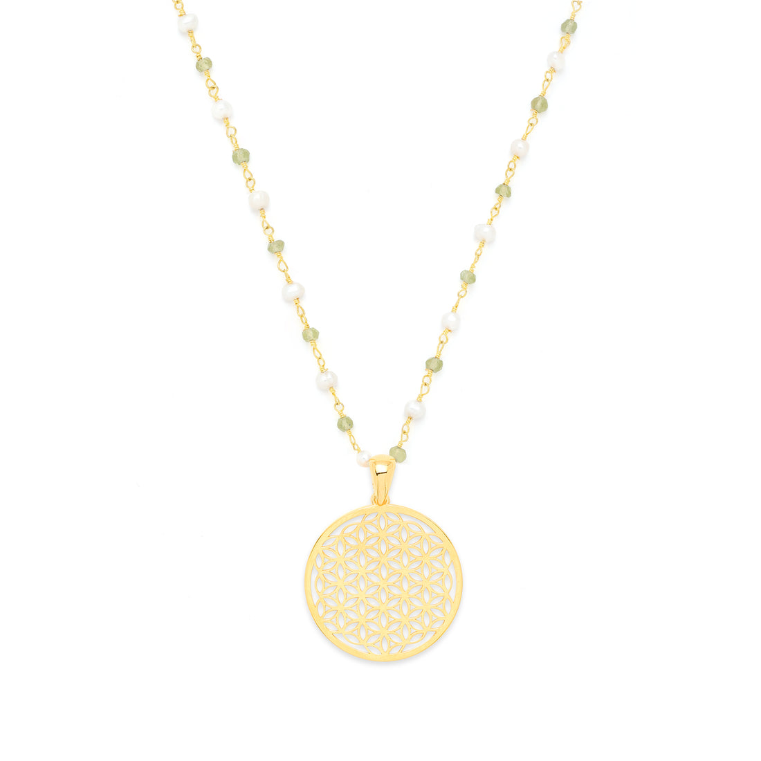 Divine Life Force Flower of Life Necklace, Pearl & Peridot, 18K Gold
