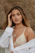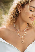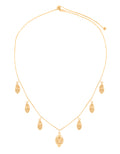 Named for the Greek Goddess who imparts strength and health to others, this adjustable necklace, with its design reminiscent of feathers or scalloped shells, is a perfect layering necklace, or an eye catching statement worn on its own.