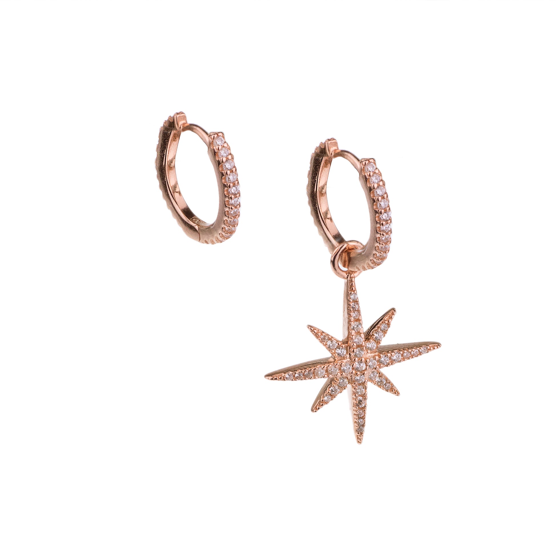 North Star charm measures 19mm by 19mm, huggie hoop has an outer diameter of 13.5mm, both encrusted in white zirconia diamond pave for celestial sparkle.