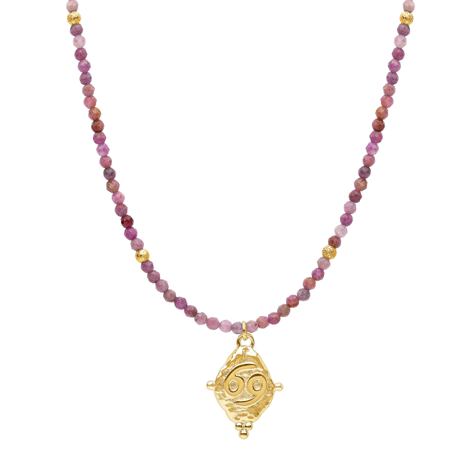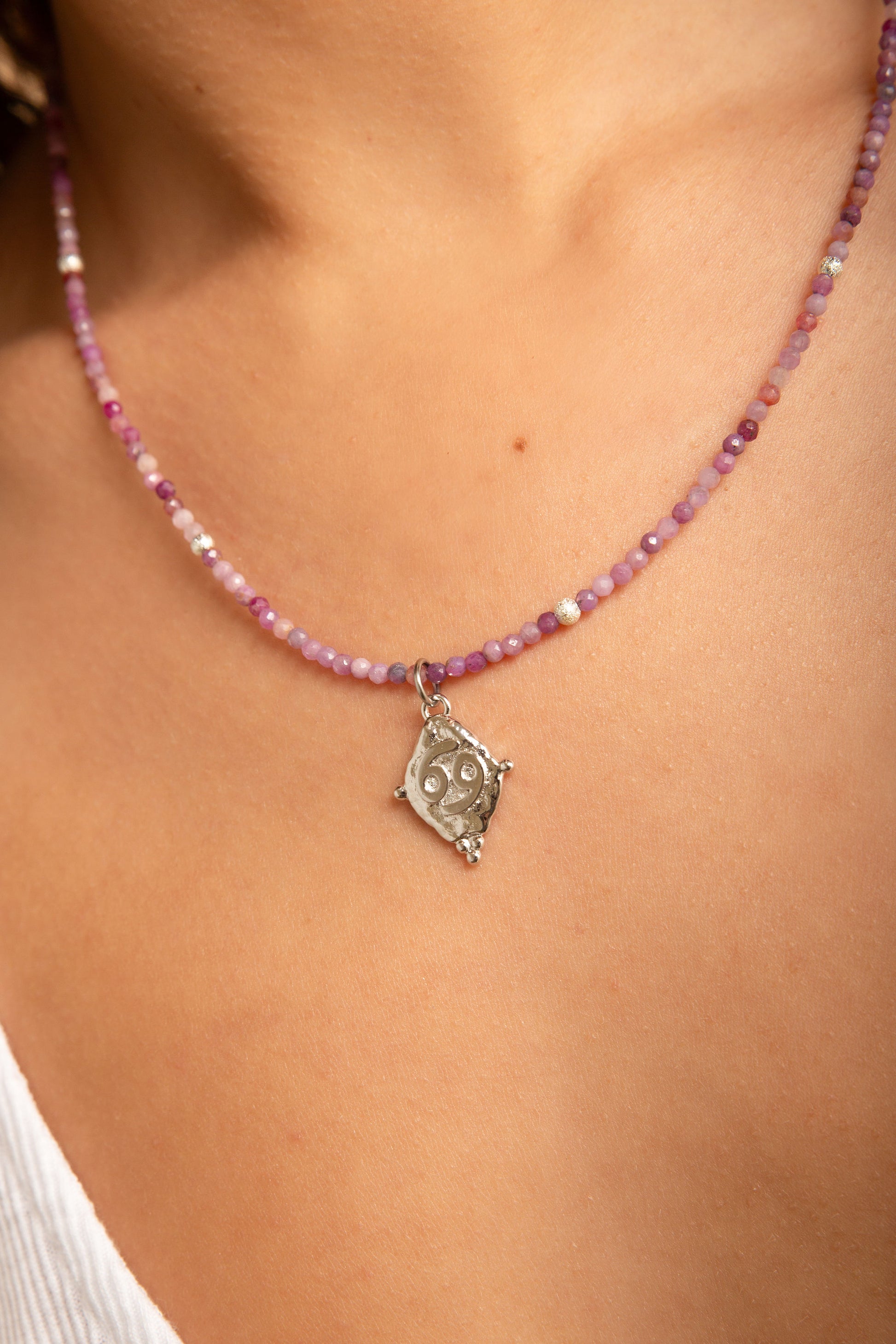 Nurturing yet powerful, our Cancer gemstone choker features radiant ruby beads paired with a vintage-inspired Cancer symbol charm. Ruby, the stone of vitality and devotion, resonates with Cancer’s deep emotional waters by igniting courage, passion, and protective strength. While Cancer is known for sensitivity and intuition, ruby helps channel that energy into empowerment, confidence, and resilience—offering a steady flame within the heart.
