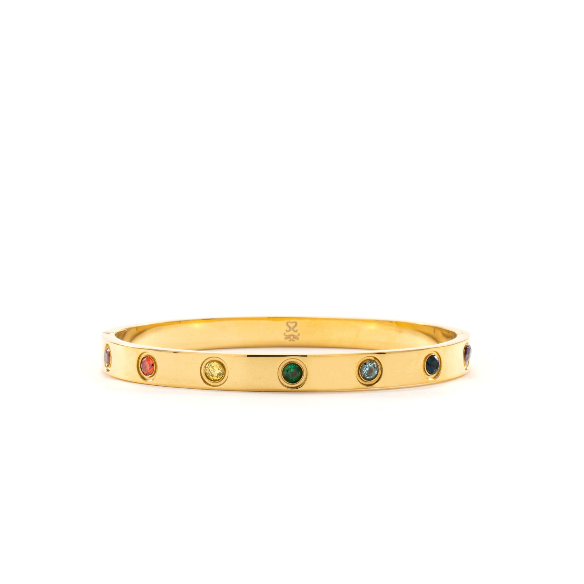 This eye-catching and modern bangle utilizes the power of color therapy to heal and activate your chakras. 14 zirconia stones represent the 7 major chakras of the body: