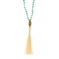 The mala is completed with gold filigree accents, a repousse style carved guru bead in 18k antique gold plated brass, and cream colored tassel.
