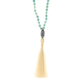 The mala is completed with silver plated brass filigree accents, a repousse style carved guru bead in white rhodium plated brass, and cream colored tassel.