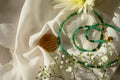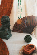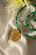 Attract abundance and blessings with the Flower of Life and three powerful green gemstones: Chrysoprase, Aventurine, and Spinel.