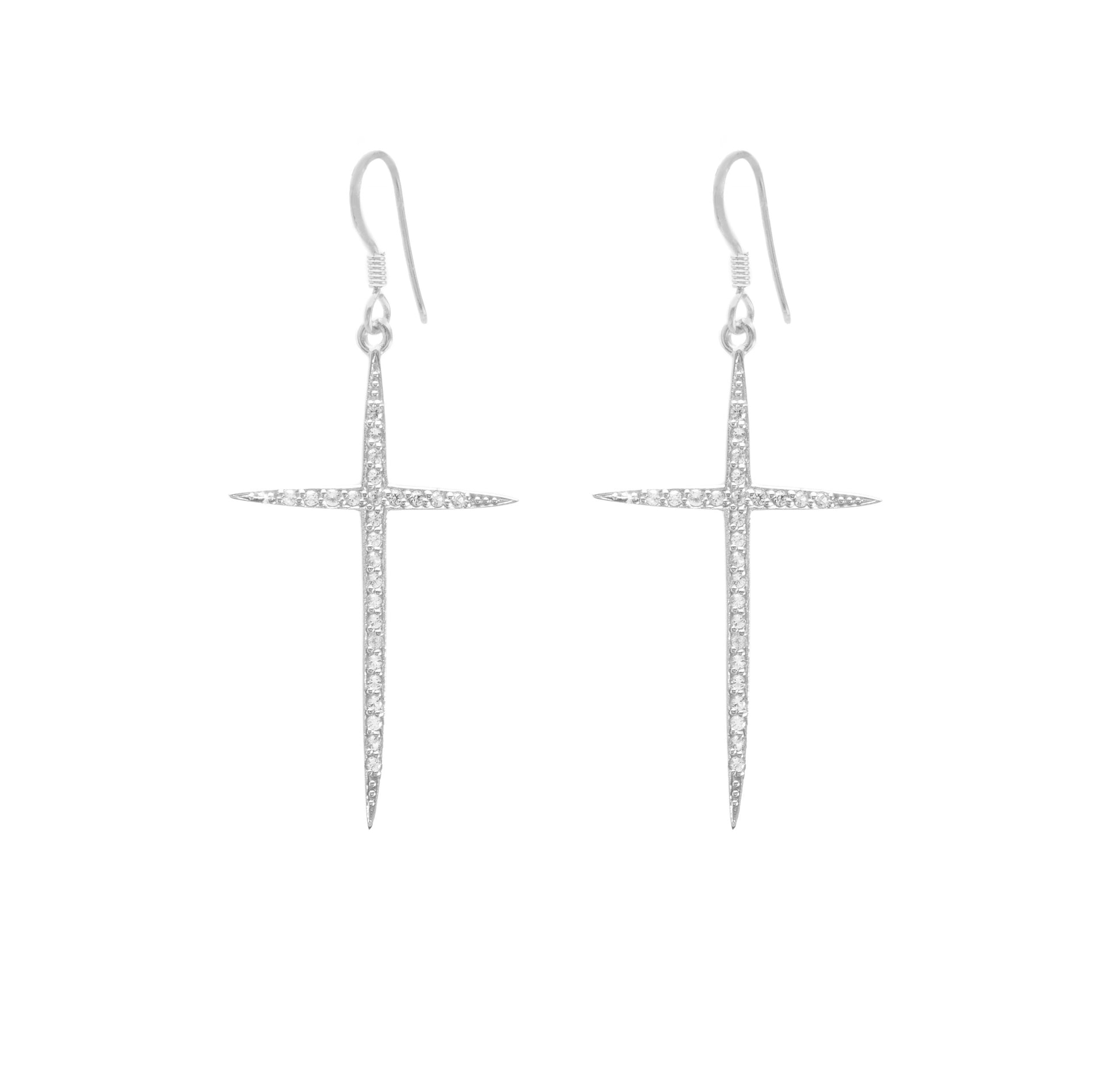 These sophisticated cross earrings blend spiritual symbolism with contemporary elegance. Crafted in sterling silver with white rhodium plating, they feature radiant white topaz pavé that catches light beautifully. White topaz is traditionally associated with spiritual elevation, divine connection, and protective energy.
