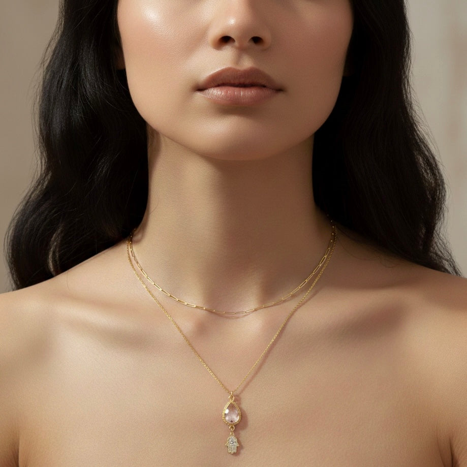 This gold Hamsa moonstone necklace is crafted for protection, balance, and spiritual energy. The luminous grey moonstone set in gold over sterling silver—pairs with the Hamsa hand, a time‑honored symbol of defense against negative energy and the evil eye. Moonstone itself is prized for protective qualities and calming, insight‑driven energy, especially in grey varieties that connect to deeper perception and transformation.