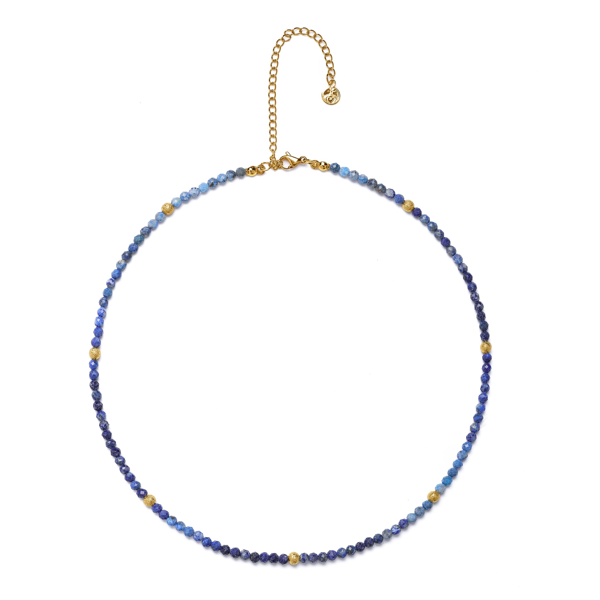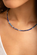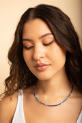 An embodiment of ancient wisdom and celestial elegance, the Oracle of the Deep Lapis Choker is crafted with luminous 3mm faceted lapis lazuli beads that echo the depth of starlit skies. Long revered for its spiritual healing properties, lapis lazuli is believed to awaken inner wisdom, heighten intuition, and encourage clear, authentic expression. Cool silver-plated accents enhance the stone’s rich blue tones, lending an ethereal, moonlit finish to this refined design. Resting delicately at the collarbone, this choker is both adornment and talisman—an offering of clarity, protection, and quiet power.