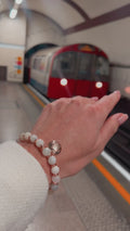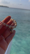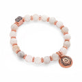 Activate your Sacral Chakra with this creamy moonstone stretch bracelet that features an engraved rose gold plated brass Sacral chakra charm, and Seven Saints signature bead.