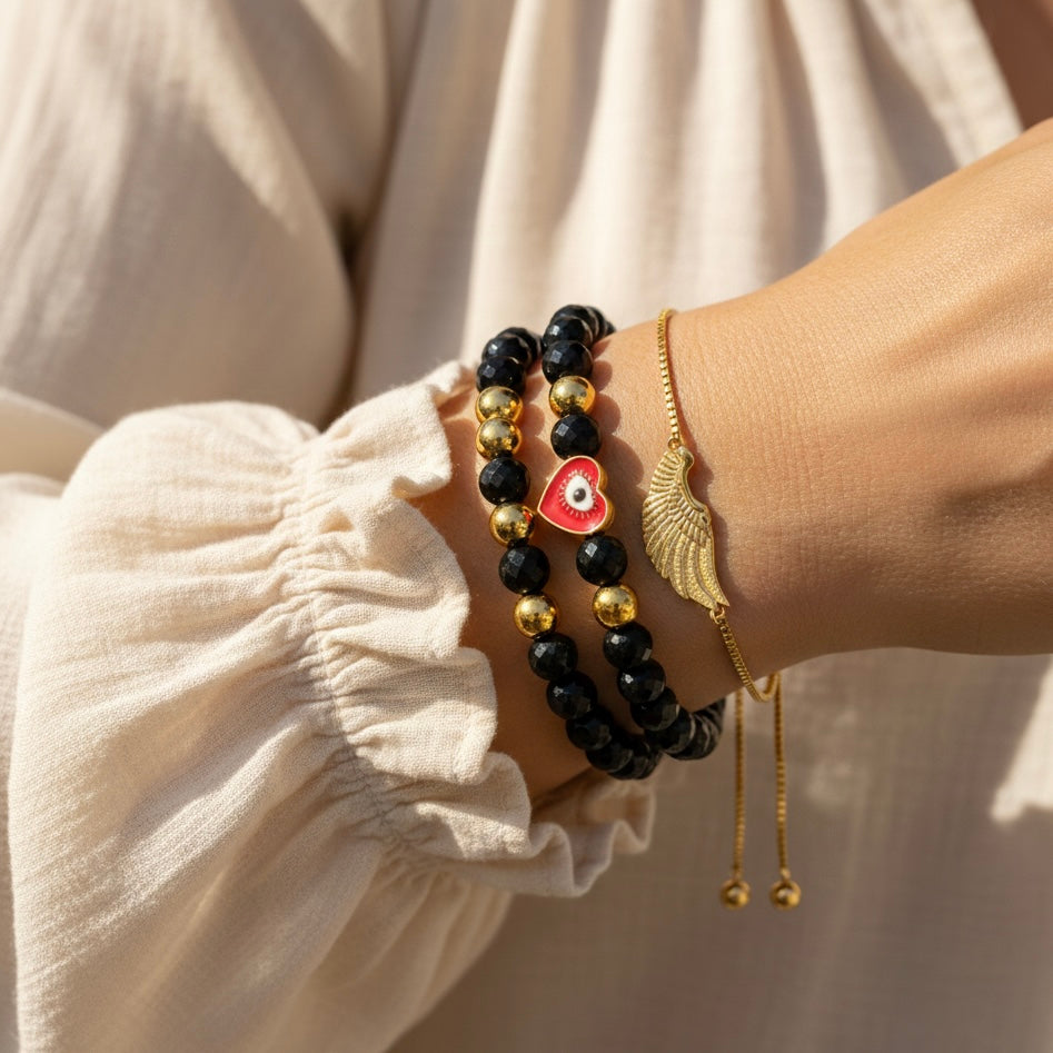 Onyx anchors the spirit, absorbing negativity and restoring energetic balance, while the red heart evil eye stands watch over emotional bonds, passion, and vulnerability. This talisman is especially potent for romantic partnerships, self-love rituals, and periods of emotional renewal. Activate by placing your hand over your heart and setting an intention of love without harm, connection without intrusion.